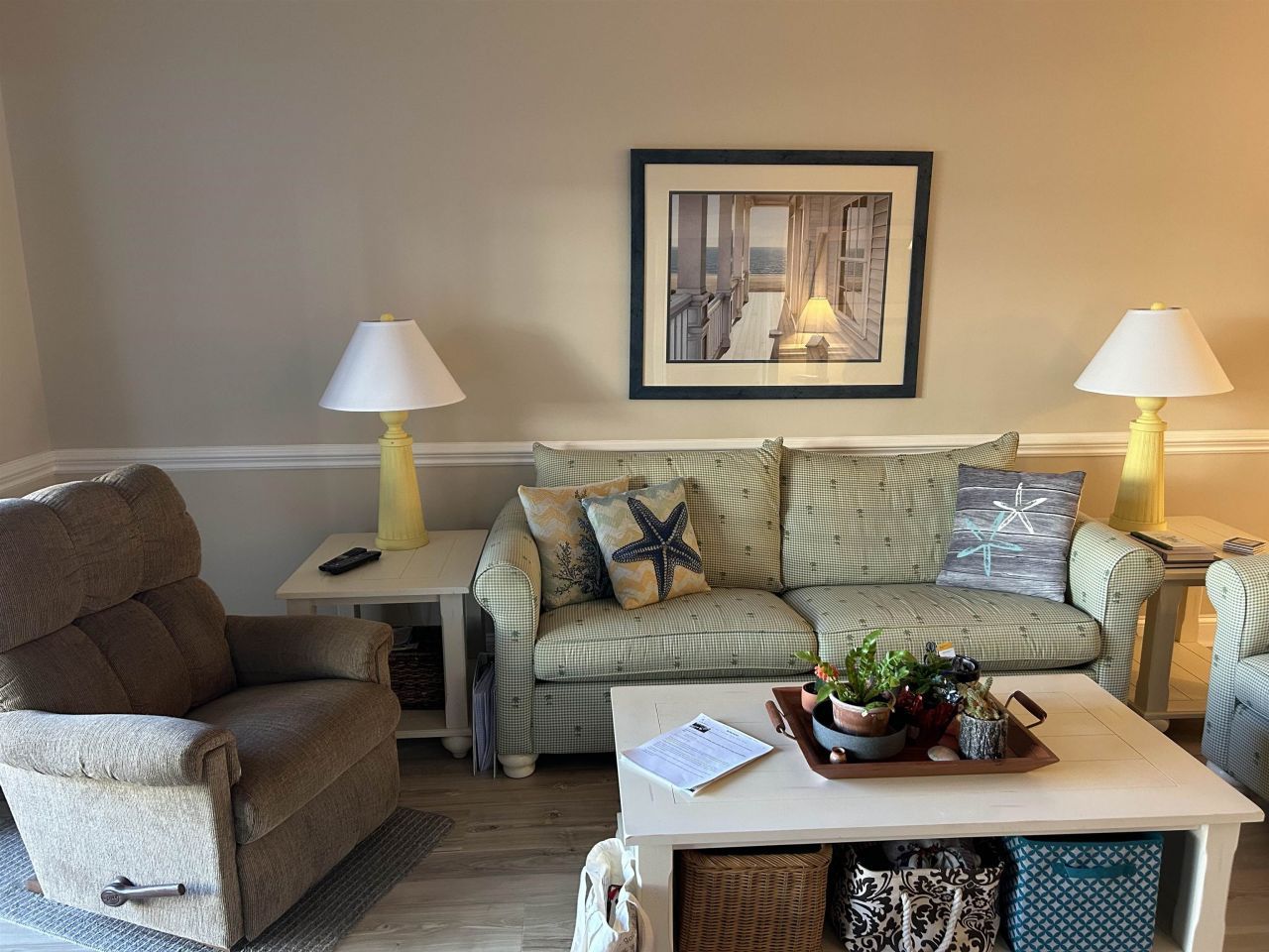 This lovely two bedroom, two bath villa on the first floor has beautiful flooring in the living and dining areas. The nine foot ceilings give this home an open feeling. There are two walk in closets in the Primary Bedroom, as well as a home office area.Villa 1203 has been well maintained, with such extras as a new water heater, new dining room table and chairs, newer washer, new tile backsplash, new faucets throughout, new custom shower door in primary bathroom, new garbage disposal and new microwave. Very peaceful patio near the pond offers a place to relax. Seller is taking some items, but there will be plenty for you to begin using immediately. Agent will have access to list. Enjoy golfing, miniature golf, driving range, indoor heated pool, huge outdoor pool, excellent fitness center, grilling areas, outdoor showers, and a shuttle to the beach in summer. The Tupelo Bay lifestyle includes fun activities, a great community of people and even a library in the Amenities Center. Join us!
