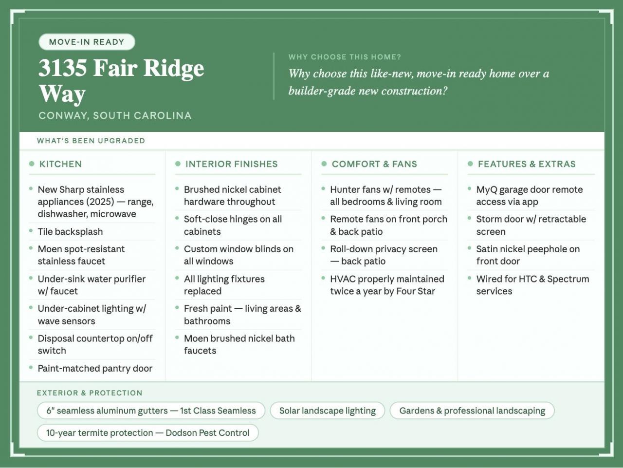 Nearly New Single-Story Home in Carolina Forest School District Move-In Ready Lightly lived in and nearly new, this single-story, split floor plan home combines modern construction with thoughtful upgrades without the need for post-move-in projects. Located just moments from Conway Medical Center, nearby medical offices, Coastal Carolina University, downtown Conway, and Myrtle Beach shopping and dining, it offers convenient, low-maintenance living in a sought-after community. The open-concept layout creates the perfect gathering space centered around a kitchen with granite countertops, oversized island, tile backsplash, walk-in pantry, Moen spot-resistant stainless steel faucet, motion-sensor under-cabinet lighting, under-sink water purifier, and new Sharp stainless steel appliances (2025). A convenient garbage disposal switch is added to the countertop for easy access. All cabinetry features brushed nickel hardware and soft-close hinges. Additional interior upgrades include remote-controlled ceiling fans throughout, custom window blinds, upgraded lighting, gutters, and an insulated garage door with overhead lighting. The private owners suite is tucked away for privacy and includes an oversized walk-in closet plus an additional smaller closet and en suite bath with double vanity and 5-foot shower. A spacious covered rear porch with roll-down privacy screen and ceiling fan in both the front and rear porch, along with a professionally landscaped yard with solar lighting, expanding the living space outdoors. Door window tints can be easily removed to increase natural sunlight. This move-in-ready single-floor home offers comfort, style, and efficiency near the desirable Carolina Forest location, just minutes from healthcare, schools, and shopping. Community amenities include clubhouse, pool, fitness center, and playground, providing a versatile lifestyle for a wide range of residents. *some photos have been virtually staged* *grass has been visibily enchanced in select photos*