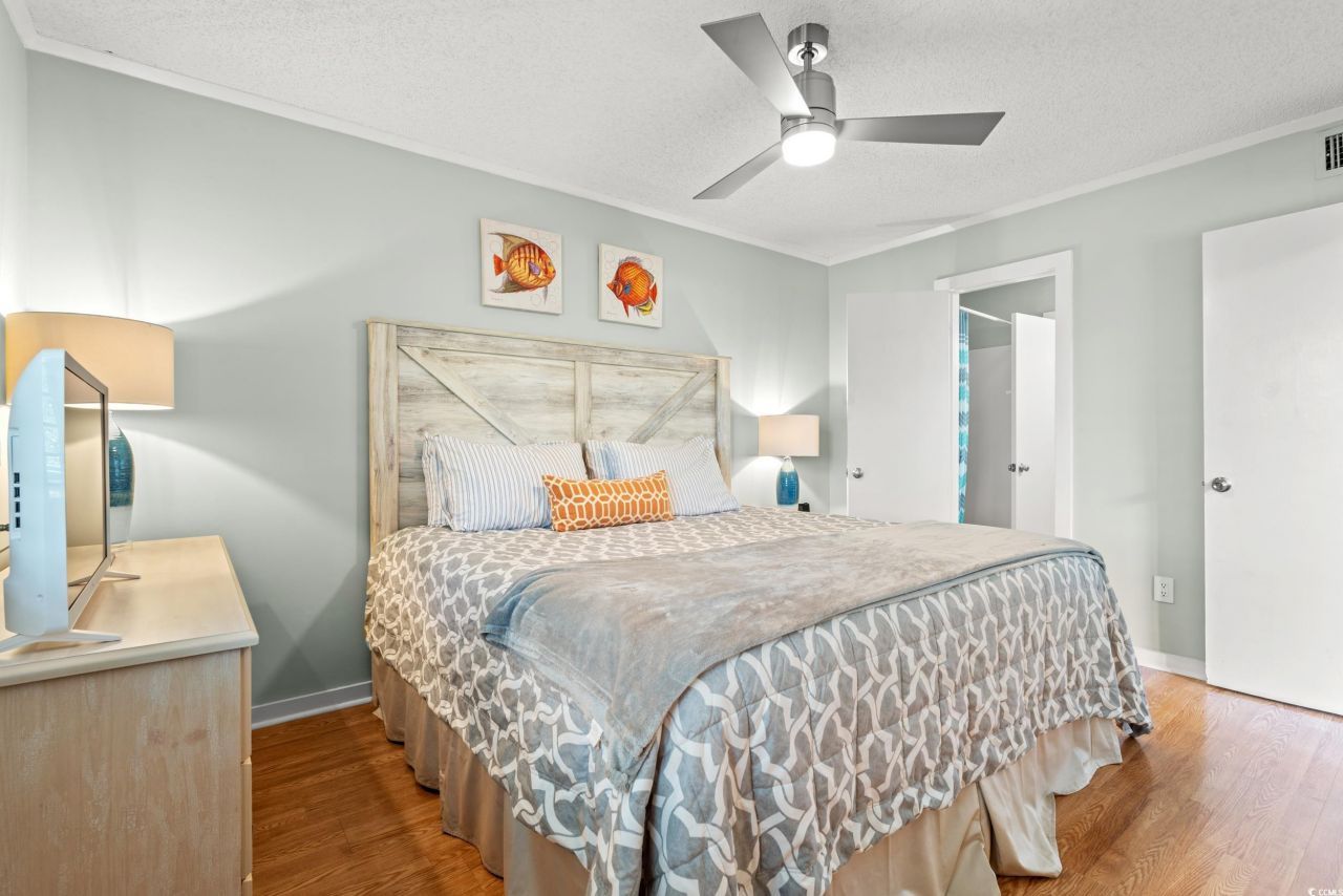 This is a lovely condo with an amazing location, sitting in the middle of a 57-acre oceanfront resort community. Located within steps of the Four Seasons restaurant, bar lounge, courtyard, outdoor pool, indoor pool and most especially the BEACH. This unit has some very nice upgrades, like plantation shutters in the bedroom and foyer, the kitchen has new shaker cabinets, with a beautiful blue subway tile backsplash, quartz countertops along with a new sink and faucet. The bathrooms have updated vanities, mirrors, lighting and faucets. LVT flooring runs throughout this units except for the baths and kitchen, which are a large ceramic gray tile. This unit overlooks the pool area, beautiful trees and landscaping. Ocean Creek has beautiful, manicured grounds, pools, tennis courts, a pickleball court, putting green, playground and an oceanfront beach club. The beachfront here is amazing and a must see! Ocean Creek is just a short walk away from the wonderful activities at Barefoot Landing, along with the other popular activities of Myrtle Beach. If peace and quiet is your desire, Ocean Creek offers that escape for you too. All figs and Sq ft are approximate