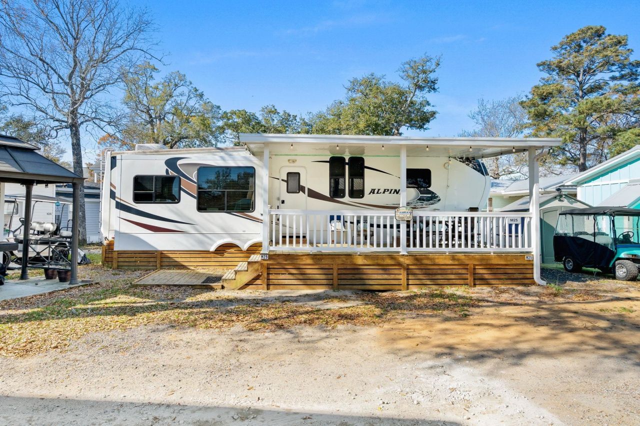 Welcome to M-25, this 2012 Alpine 5th wheel on site with attached covered porch, gazebo with BBQ, wood underpinning, hard plumbing, hurricane strapped, and shed/garage. Lot is 56 (South) x 44 (North) x 32 (East) x 35 (West). Seller is willing to remove the RV, covered beck, and shed if someone is only interested in the lot. Inside you have an immaculate 1-bedroom 1 bath. Living room features plenty of seating, electric fireplace, and ceiling fan. Dining area and kitchen with breakfast bar, island, and plenty of cabinets. Bedroom closet has washer/dryer connections, washer/dryer is also located in the outside shed/garage.