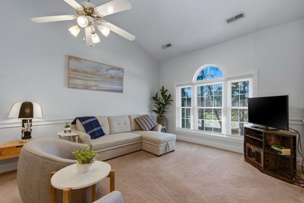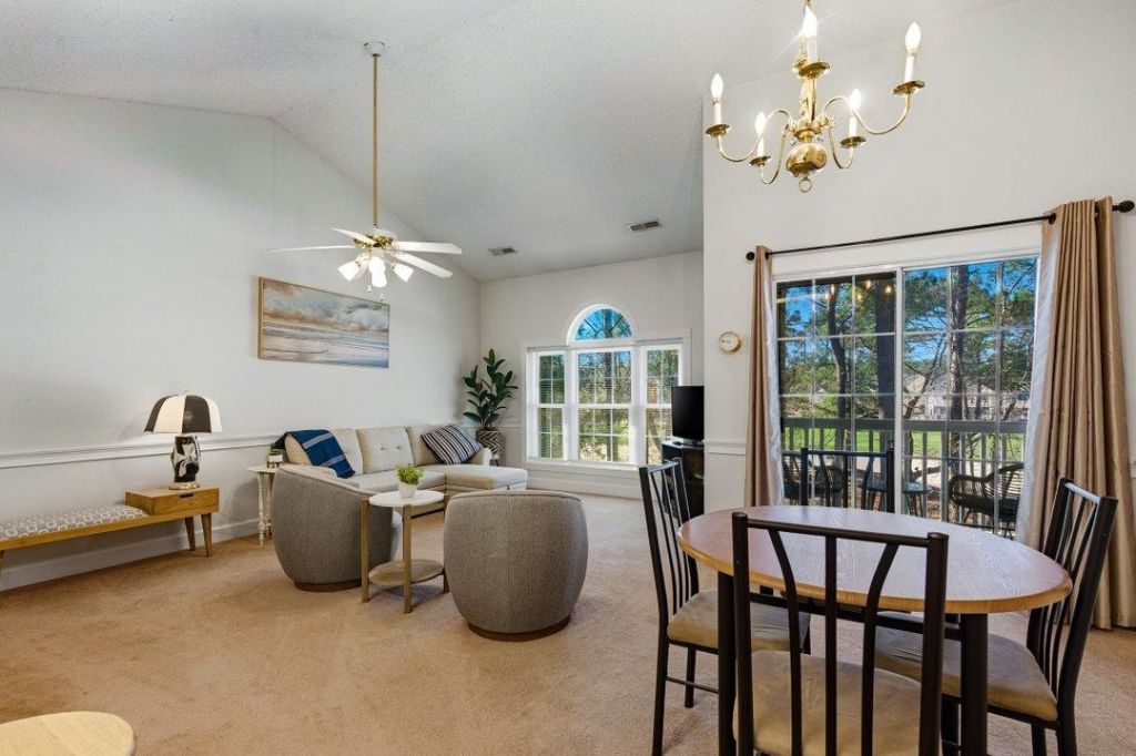 Discover an excellent opportunity in the desirable Riverwalk community, nestled along the Intracoastal Waterway and overlooking the Arrowhead Golf Course. This furnished third-floor 1-bedroom, 1½-bath condo is move-in ready and offers peaceful views of the Cypress Courses 5th hole, plus a glimpse of the pool from the private balcony. The open great room features vaulted ceilings and sliding door to the balcony, while the kitchen includes a breakfast bar and full appliance package. The primary bedroom also has a vaulted ceiling, with a full bath and stacked washer/dryer. There is a half bath convenient for guests. Enjoy resort-style amenities including an indoor pool, two outdoor pools, and an updated fitness center. Low HOA fees cover water/sewer, basic cable, insurance, and amenities. Priced to sell!